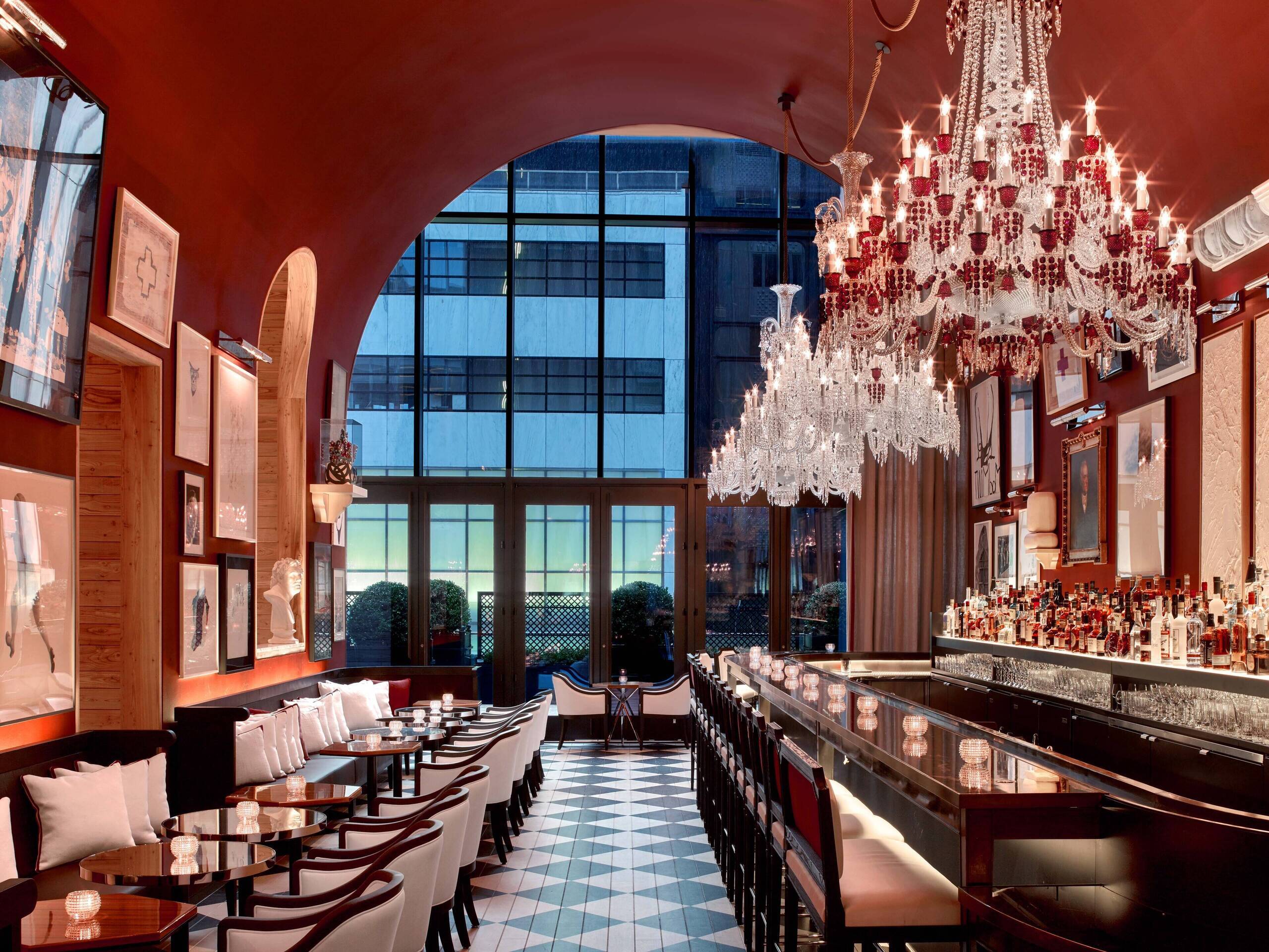 Each treatment room is adorned with a beautiful mural of sea kelp hand painted by New York artists, Lynda White and Jeff Wood. Custom Baccarat crystal sconces line the space, casting a warm glow. Adjacent to the spa’s four intimate treatment rooms, Gilles & Boissier installed luxurious canopied day beds and lined the bottom of the 50-foot swimming pool with black and white tiles, reminiscent of a sunken ballroom.