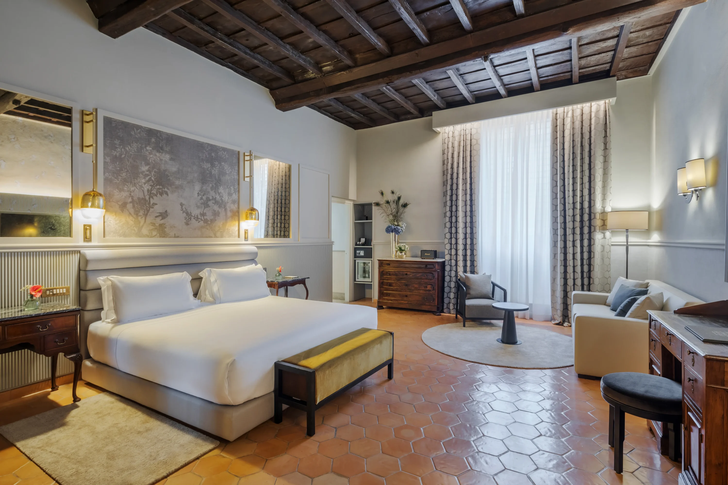 Donna Camilla Savelli's ninety-four rooms are spread across distinct wings of the former convent, each with its own character. The Deluxe Rooms and Suites occupy the wing once reserved for the nuns, with furnishings and finishes that have remained intact, while the Superior Rooms blend ancient charm with contemporary details. The renovated Classic Rooms offer elegant environments with four-poster beds, and the flagship Premier Suite features a rose window overlooking the adjacent church of Santa Maria dei Sette Dolori, with the original essence of the Monastery giving it a historical and tranquil atmosphere.