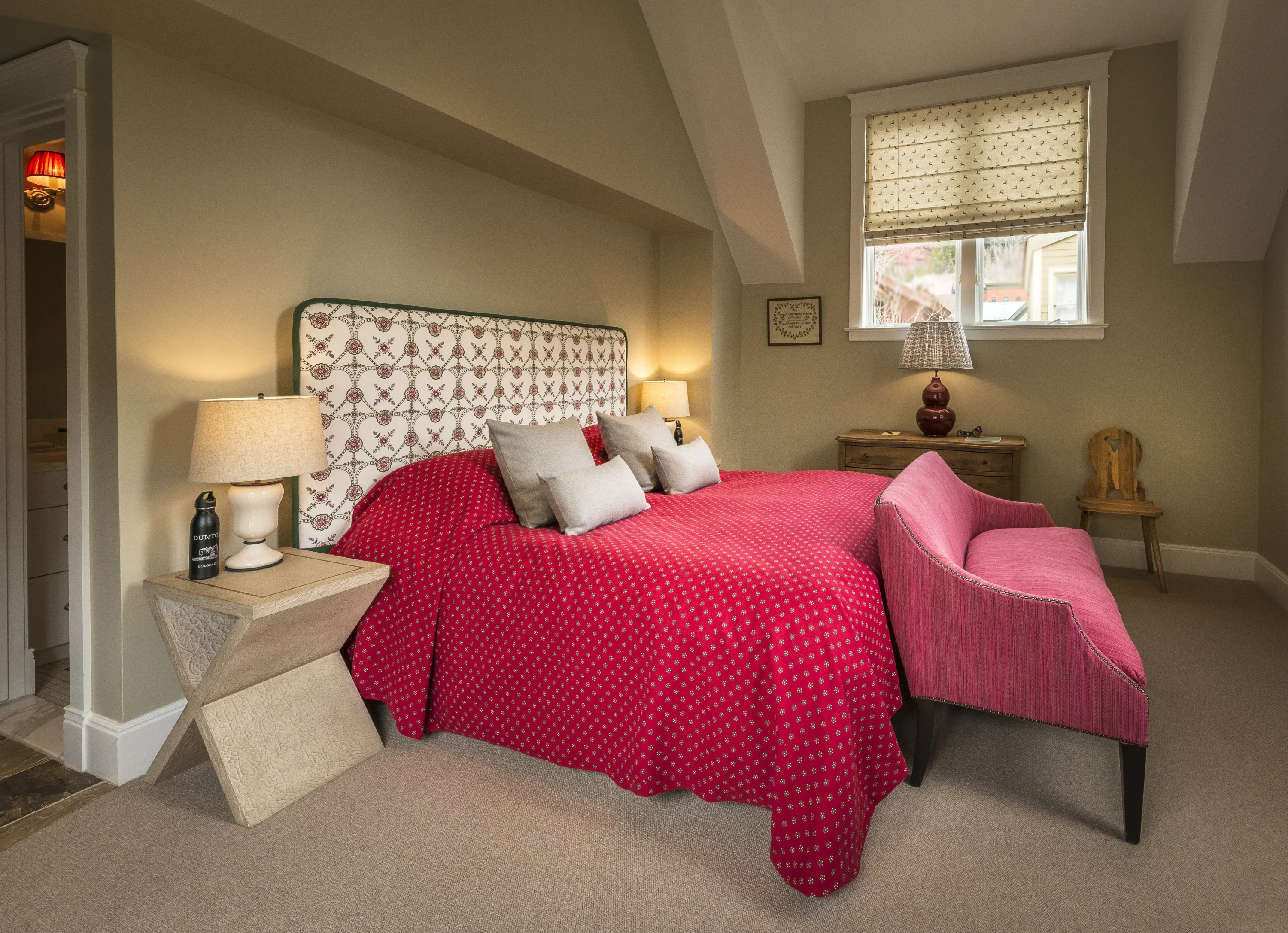 The Hirsch room sits on the second floor and offers a spacious retreat with a king-size bed dressed in cherry-colored linens, vibrant red and green accents, and an en-suite bathroom with both a bathtub and shower. Guests can enjoy views of Ajax Peak and Bridal Veil Falls. Hirsch can connect with the adjacent Gams room, making it ideal for families or small groups.