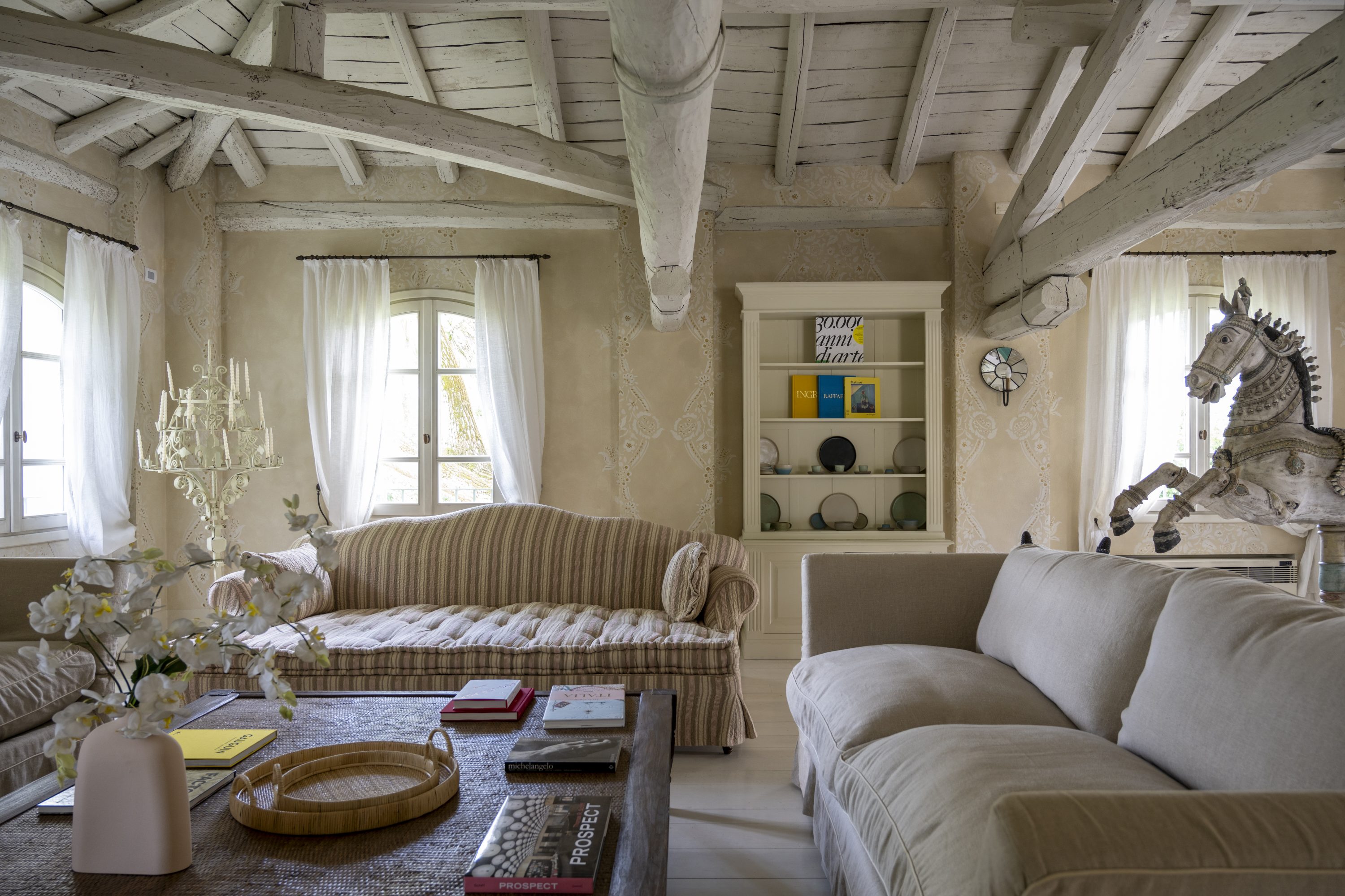 The outdoor area centers on a large private pool set within a well-kept rural landscape, with ancient shade trees and a life-size chessboard. The nearby organic kitchen garden supplies produce for seasonal tasting experiences, and a Finnish barrel sauna sits tucked away in a shaded corner of the grounds, available year-round.