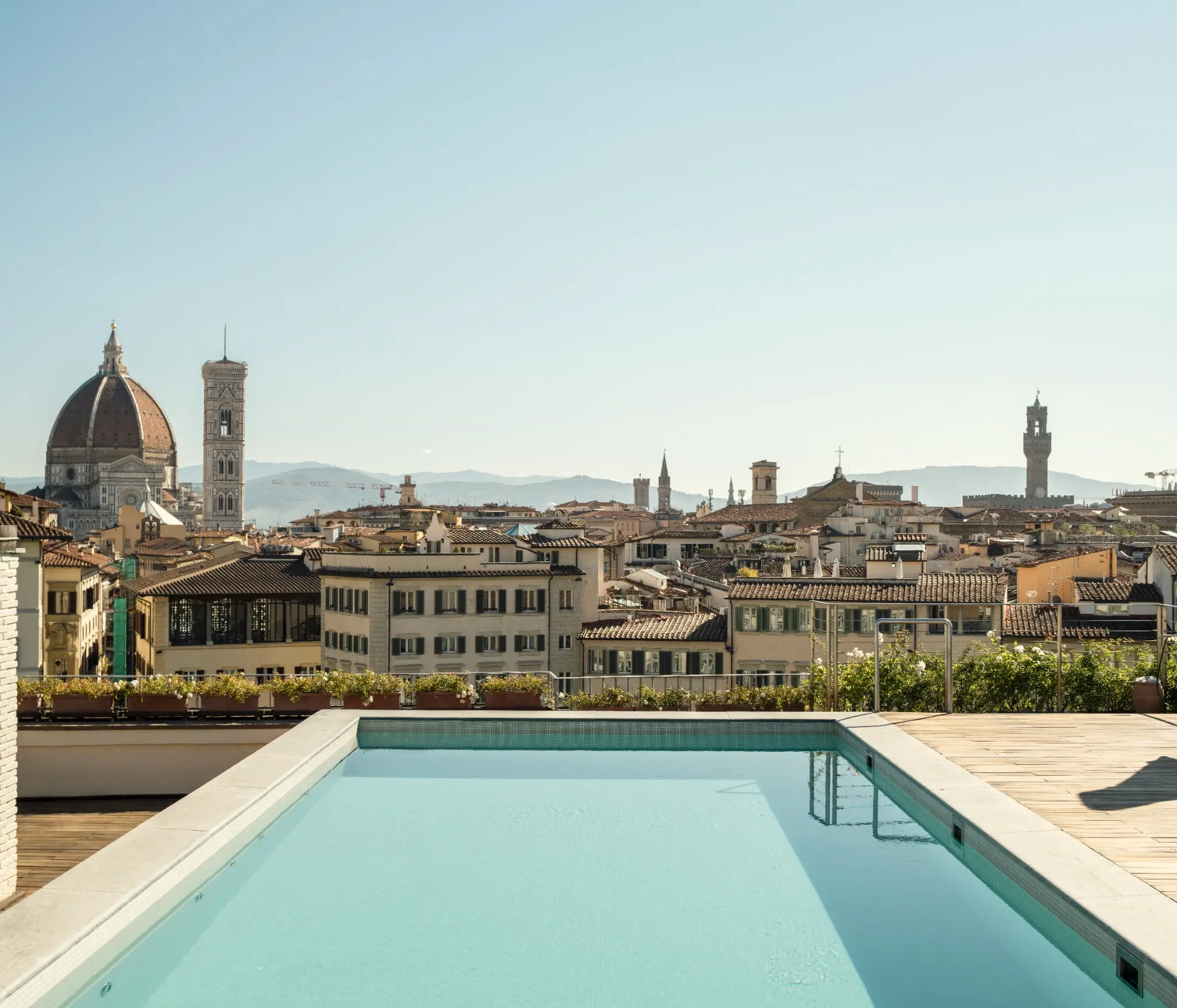 Perched atop a thirteenth-century palazzo, the rooftop pool offers a truly unique experience, with breathtaking views over Florence’s historic skyline. Heated and open seasonally from April to October, it is reserved exclusively for hotel guests and provides a serene setting unlike any other in the city.