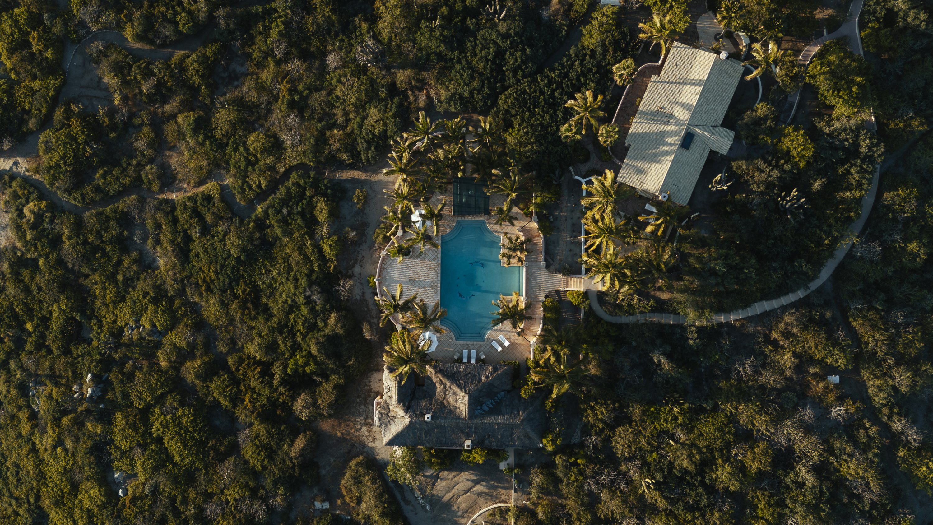A pool fringed by palms and desert greenery.