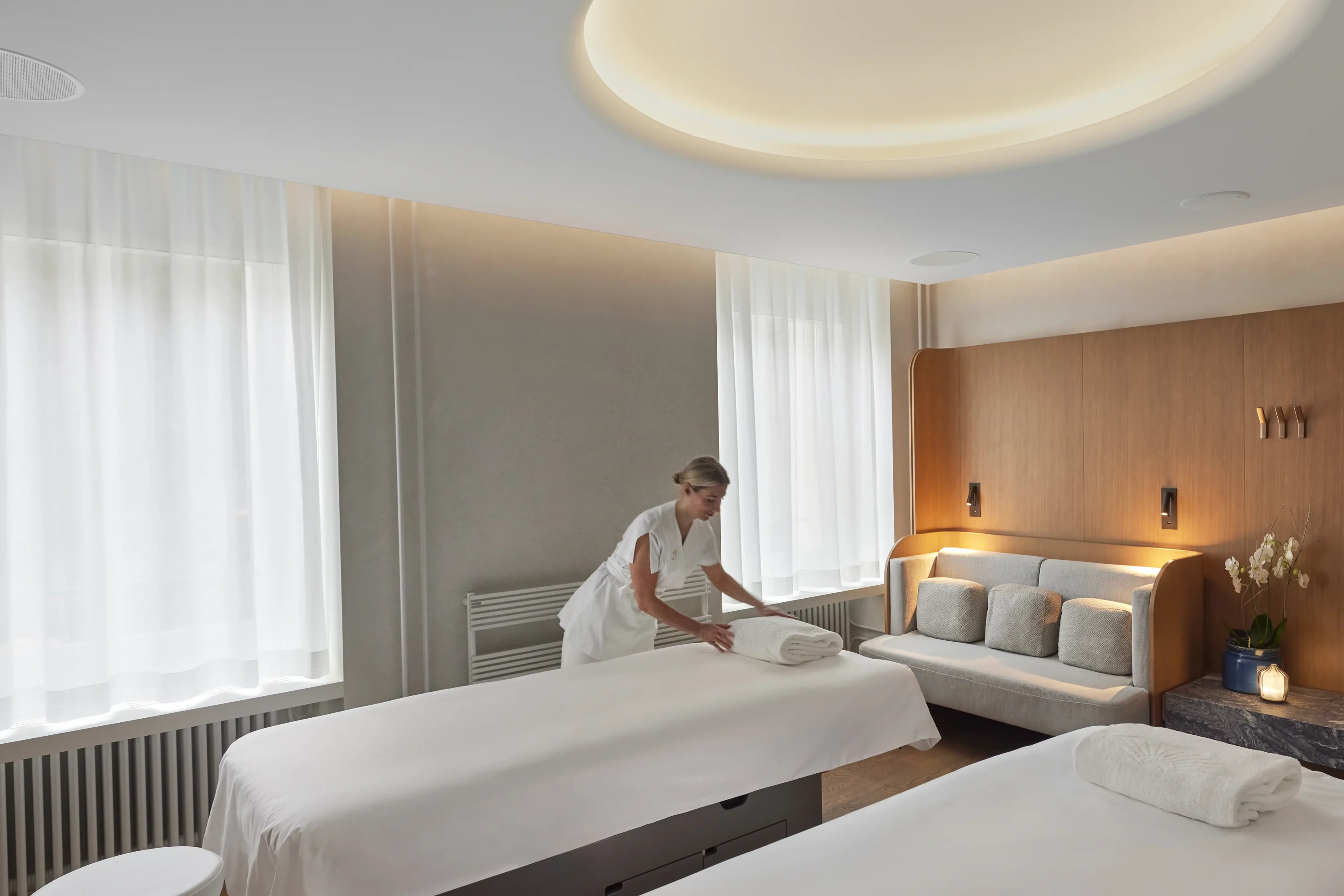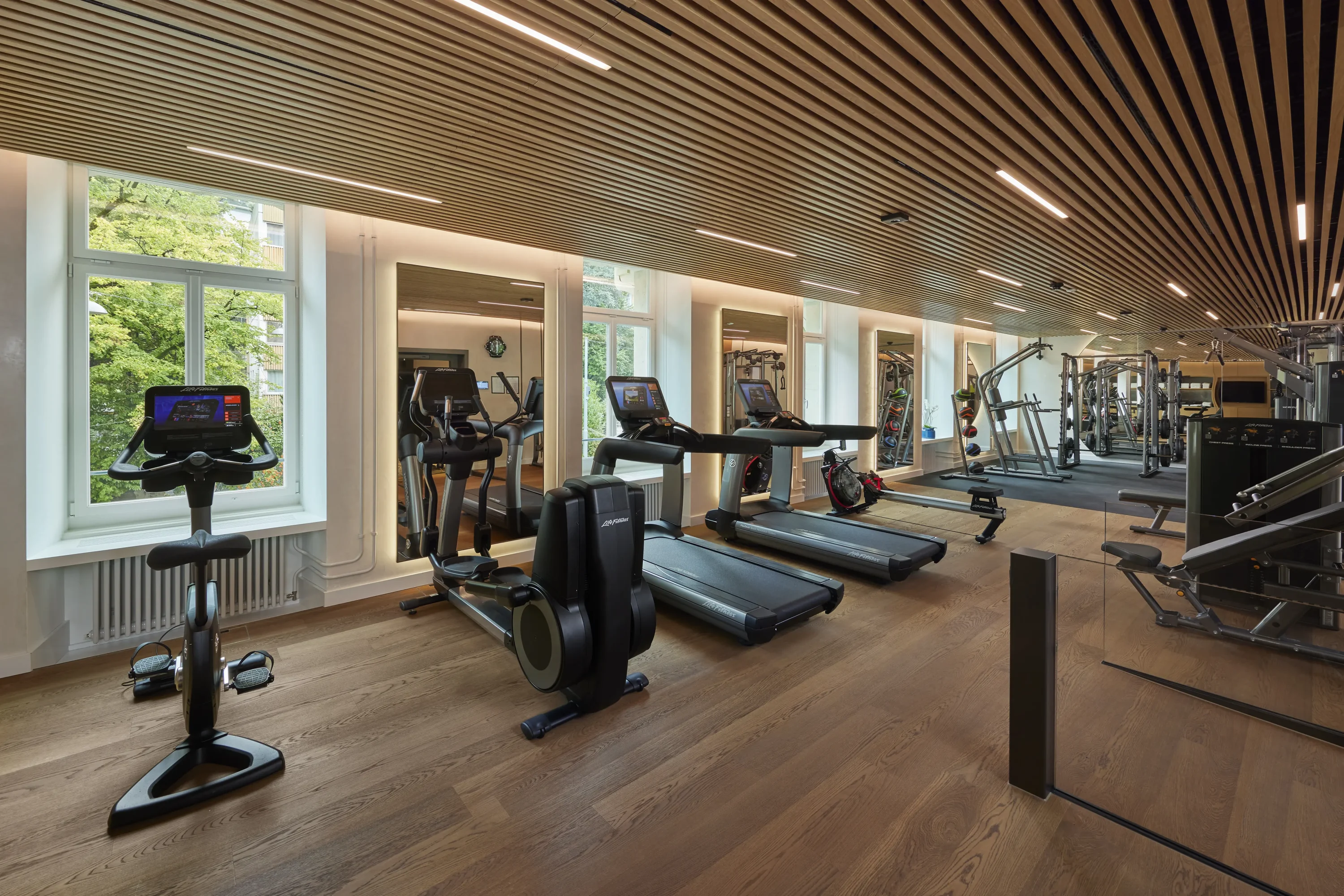 The fitness center features first-class fitness equipment by Life Fitness, suitable for people of all ages and abilities. The sauna and steam room offer pure relaxation, providing an opportunity to relax after your workout. These facilities are meticulously designed to support mobility, stability, movement readiness, peak performance, and recovery.