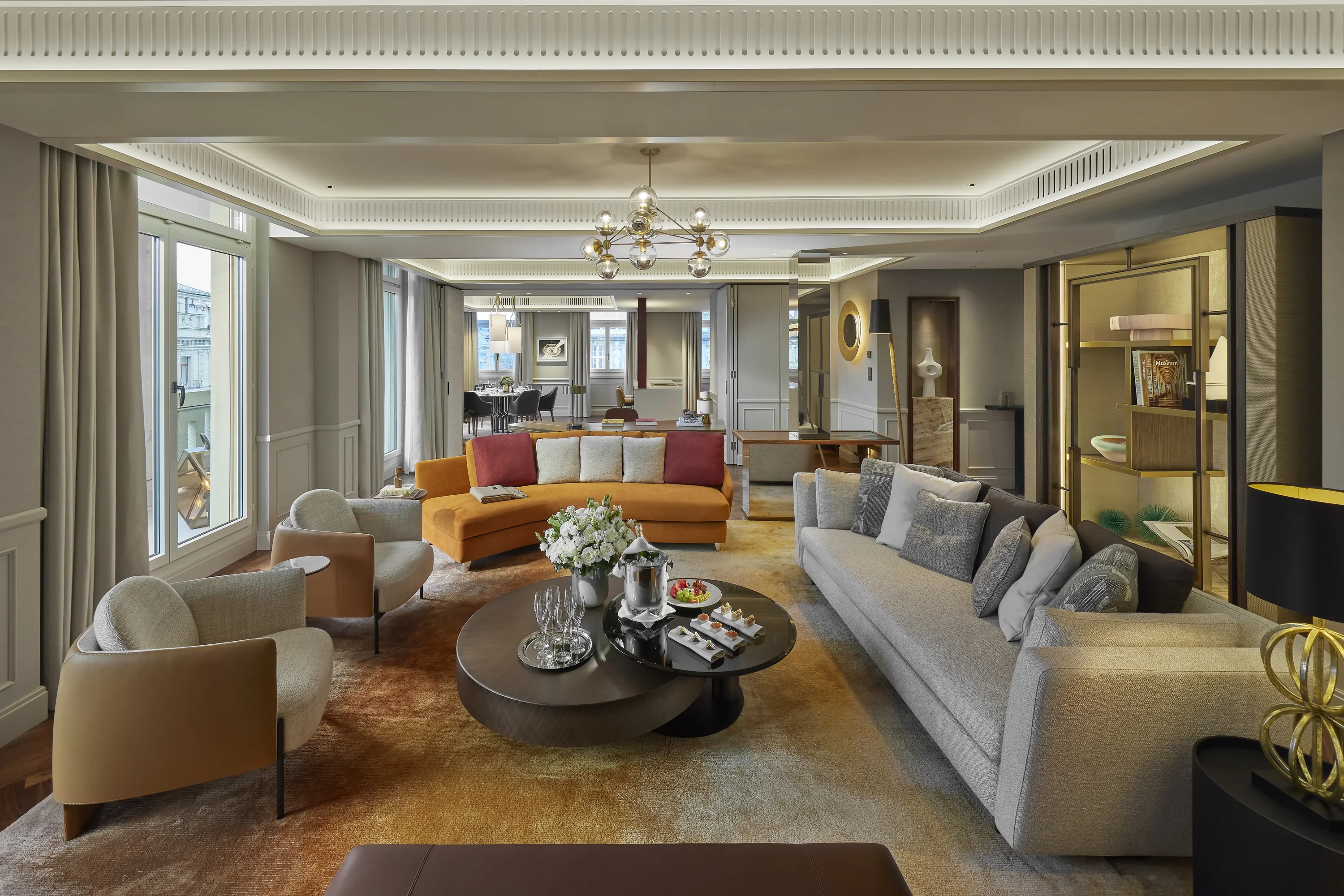 Retire to 1838, an enchanting rooftop bar with panoramic views of the city, Lake Zurich, and the Swiss Alps, offering a choice of epicurean Asian delights and artistic cocktail creations, or the Mandarin Lounge for small bites and signature Afternoon Tea served in an inviting and residential setting.