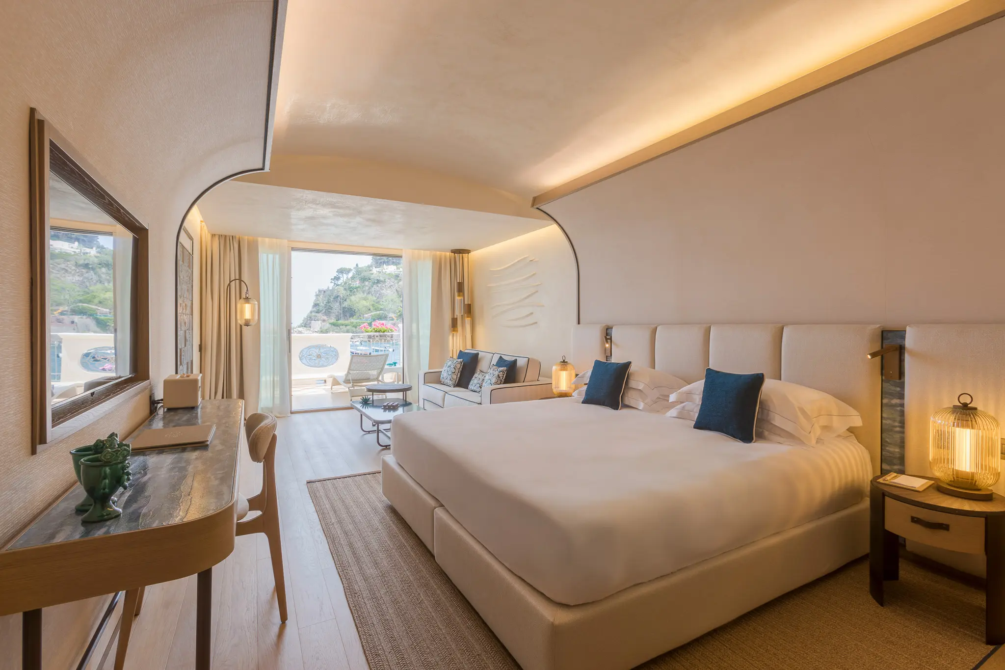 The Mazzarò Sea Palace has sixty-eight rooms and suites, each featuring a unique view of the Mediterranean Sea through large windows and private terraces. The interiors are a harmonious mix of marine-inspired colors, red shades of Sicilian marble, and golden-beach tones that all blend into the contemporary style of the decor. The exclusive Pool Suites are particularly noteworthy for those who demand the best during their stay, offering heated swimming pools and whirlpools on private terraces.