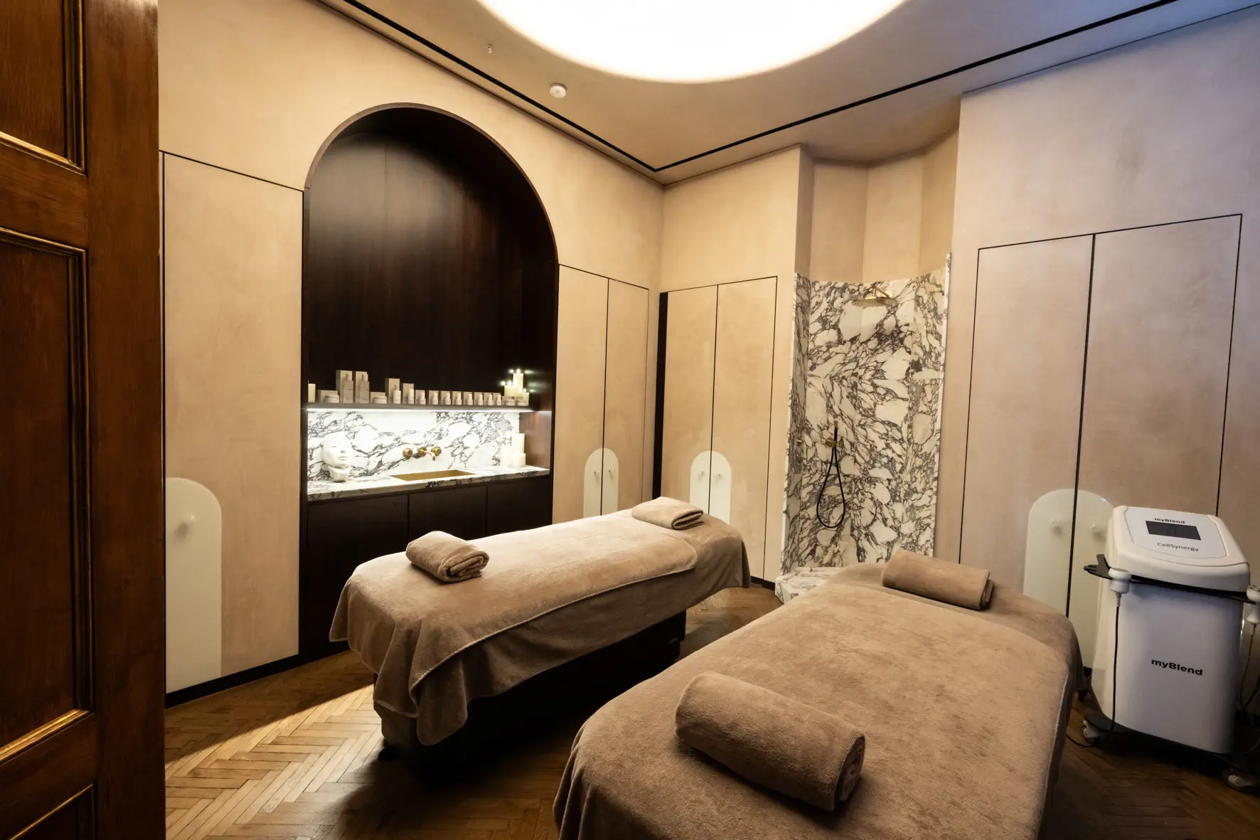 On the third floor, the bar extends the lobby’s colonnaded perspective. It's an intimate space, filled with life from morning to night, where one can sit, eat breakfast, wait for a meeting, or do a bit of work in the warm, convivial atmosphere. Sit surrounded by wood paneling, books, and the piano, and be filled with a warm feeling of pleasure at being invited into this well-kept secret. In homage to the printing industry and its Venetian origins, a thoughtfully curated library of more than four-thousand books nourishes both the mind and the gaze, along with the ceiling fresco by the artist Simon Buret.