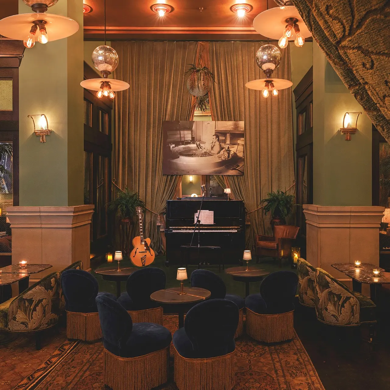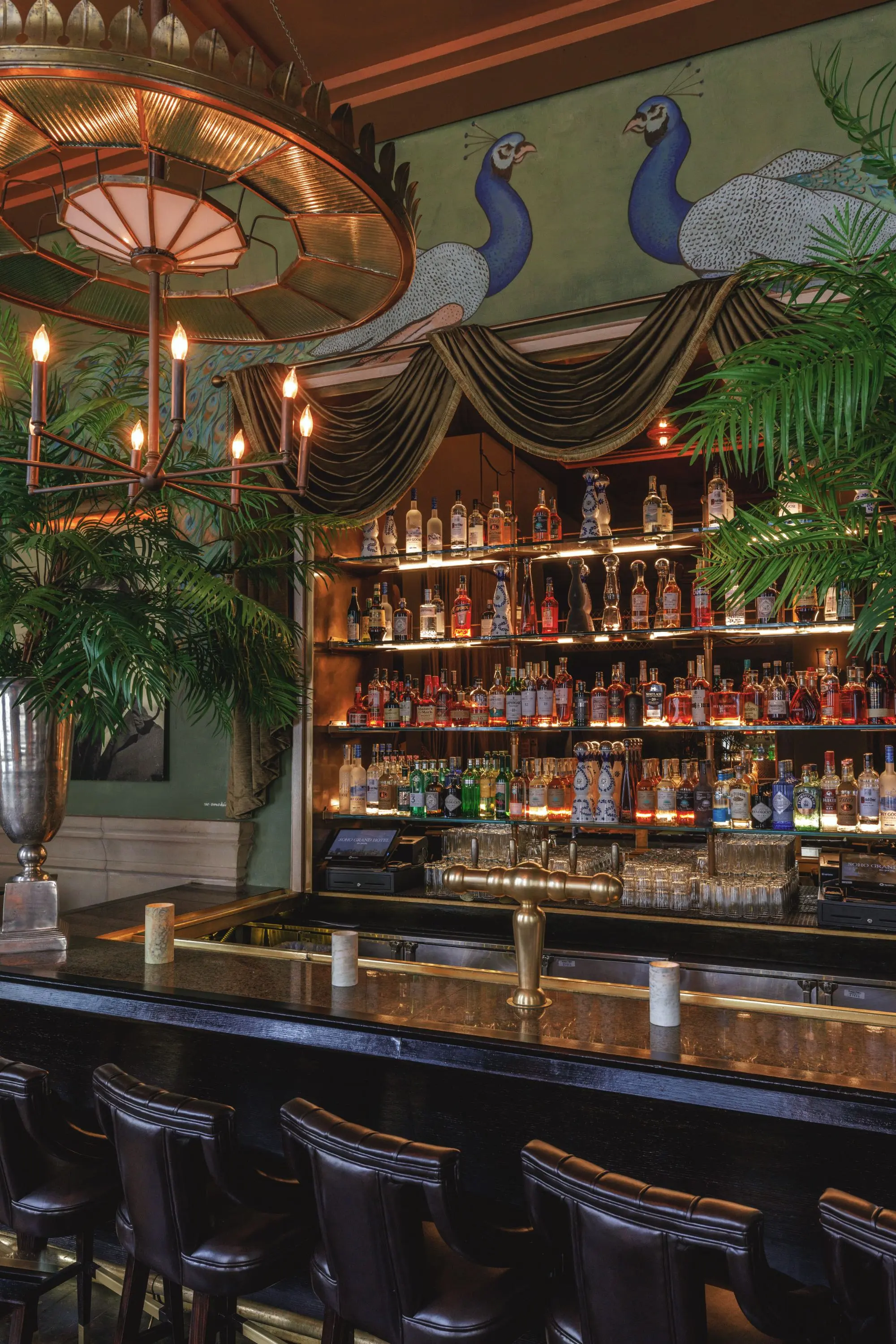 The Soho Grand has two distinct bar personalities. Step through the velvet curtain into the Club Room, a gilded, two-room hideaway lined with Terry O'Neill's oversized portraits, mixing uptown elegance with downtown edge. The crowd comes as much for the caviar service as the after-dinner dancing. The Grand Bar and Lounge is the more classic proposition: fifty rare American whiskeys, carefully crafted cocktails by mixologists Natasha David and Jeremy Oertel, and a stylish downtown crowd packed in nightly.