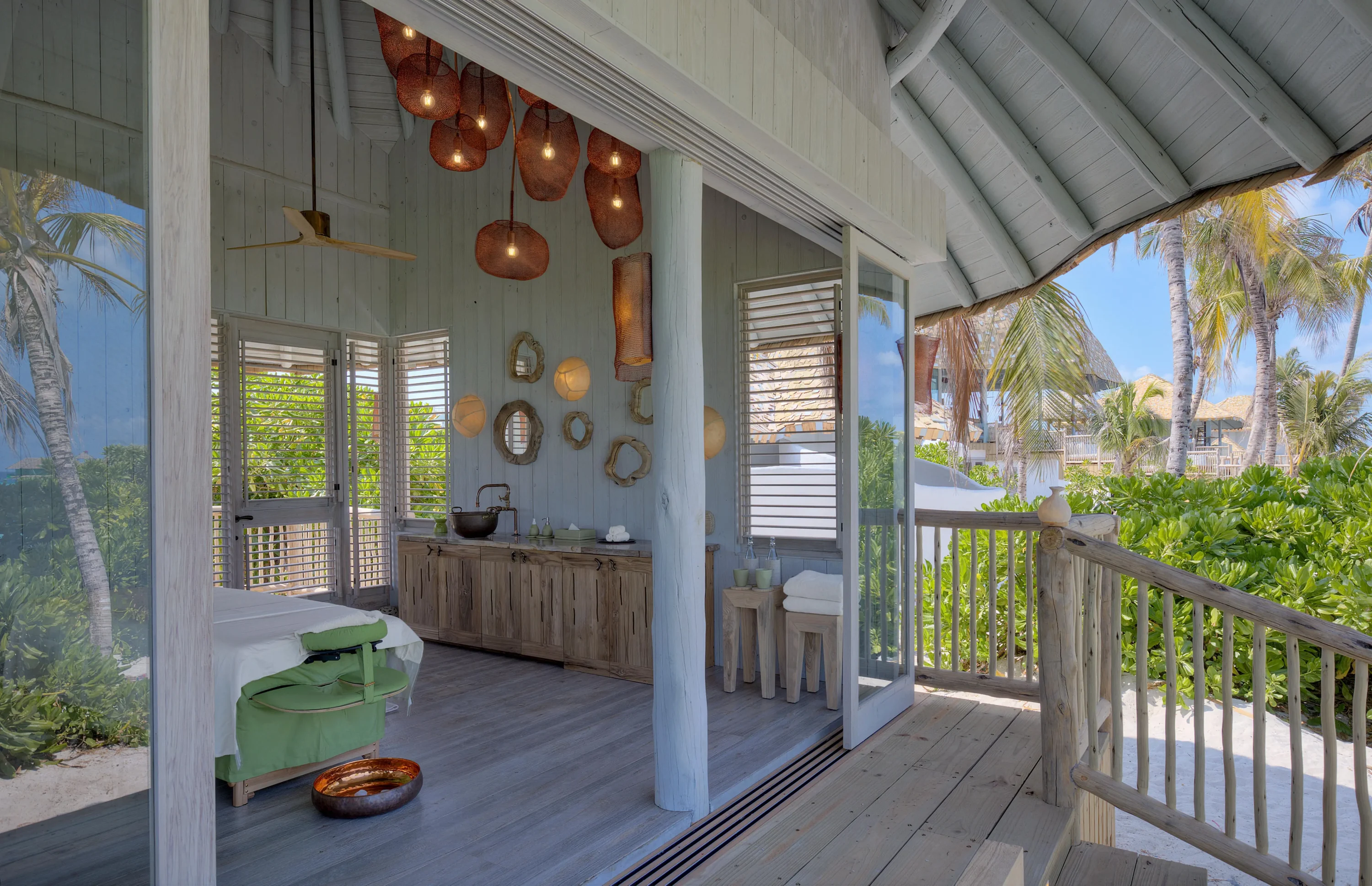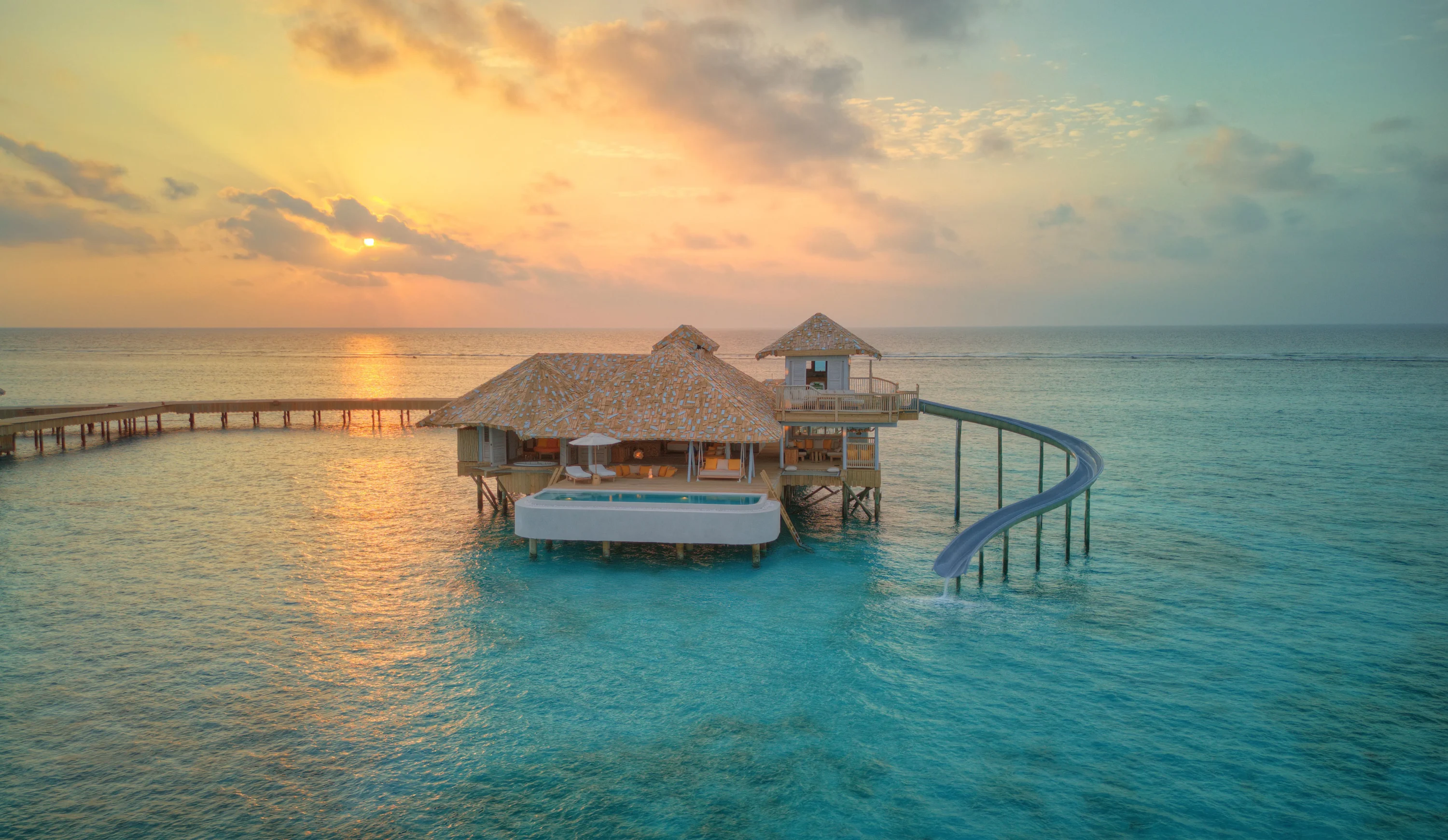 Soneva Secret's communal dining revolves around three distinct venues. The Living Room is the relaxed island hub, offering all-day à la carte, Indian curries, vegan burgers, specialty coffee, and Soneva's legendary ice cream, chocolate and cheese rooms available around the clock. So Primitive takes dinner to the northern tip of the beach, where a firepit centerpiece drives a menu of grilled seafood and meats. Out of This World is a standout experience; a castaway dining tower and wine cellar suspended over the lagoon, reached by zipline, where a multi-course tasting menu is paired with rare vintages. Beyond the communal venues, each villa's own dedicated chef crafts entirely bespoke menus across fourteen world cuisines.