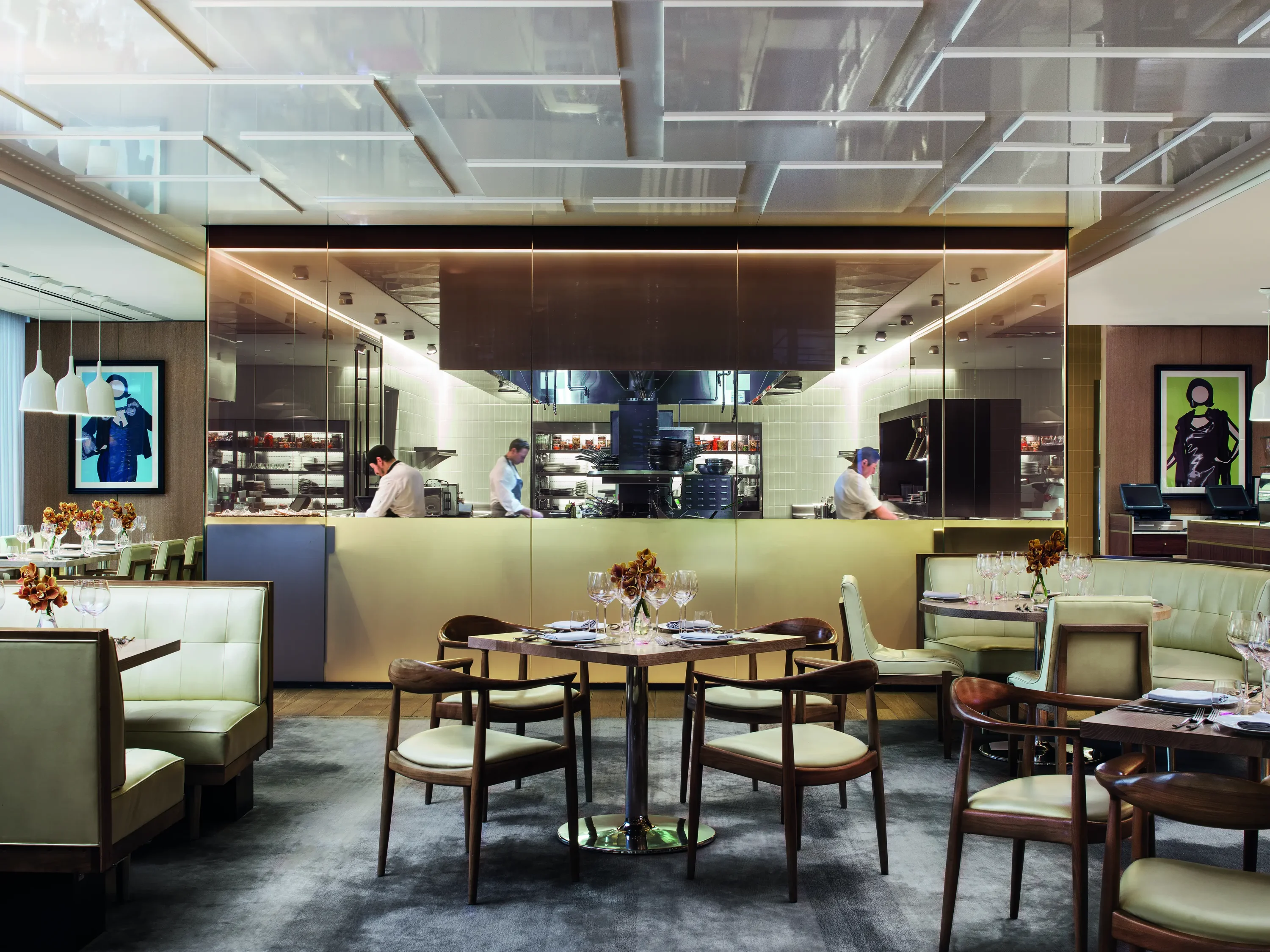 Occupying a corner of the building, Travelle's window-framed lounge is ideal for pre-dinner drinks, light artisanal bites, and late-night cocktails. While its leather-upholstered seating and ebony accents suggest old-world charm, the richly patterned stone floor and distinctive spun-brass pendant ceiling present cutting-edge design. Don't miss signature cocktails, including The London Lover, Countess Calling, La Paloma, Memento, Spirit of the Dragon, Down in Mexico, and Forbidden Fruit.